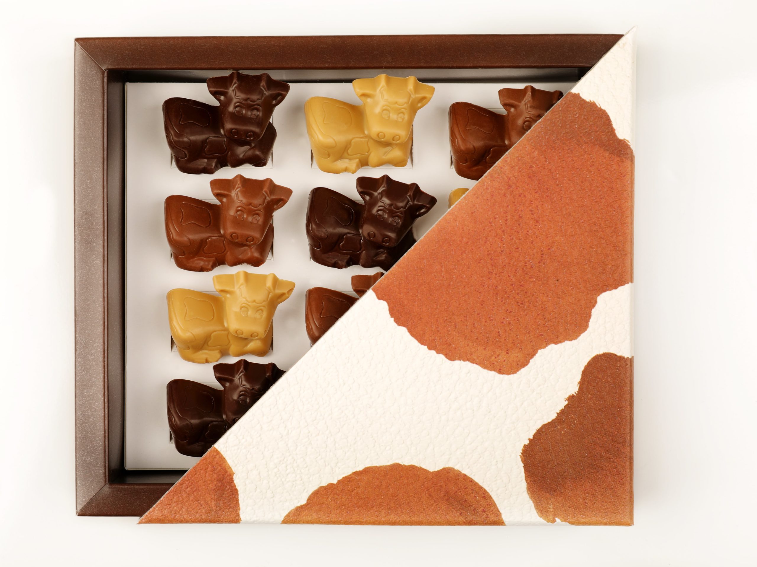 Coffret de petites vaches « les belles comtoises » en chocolat lait, noir et blond. Garnies de notre praliné 60% Maison aux noisettes du Piémont.