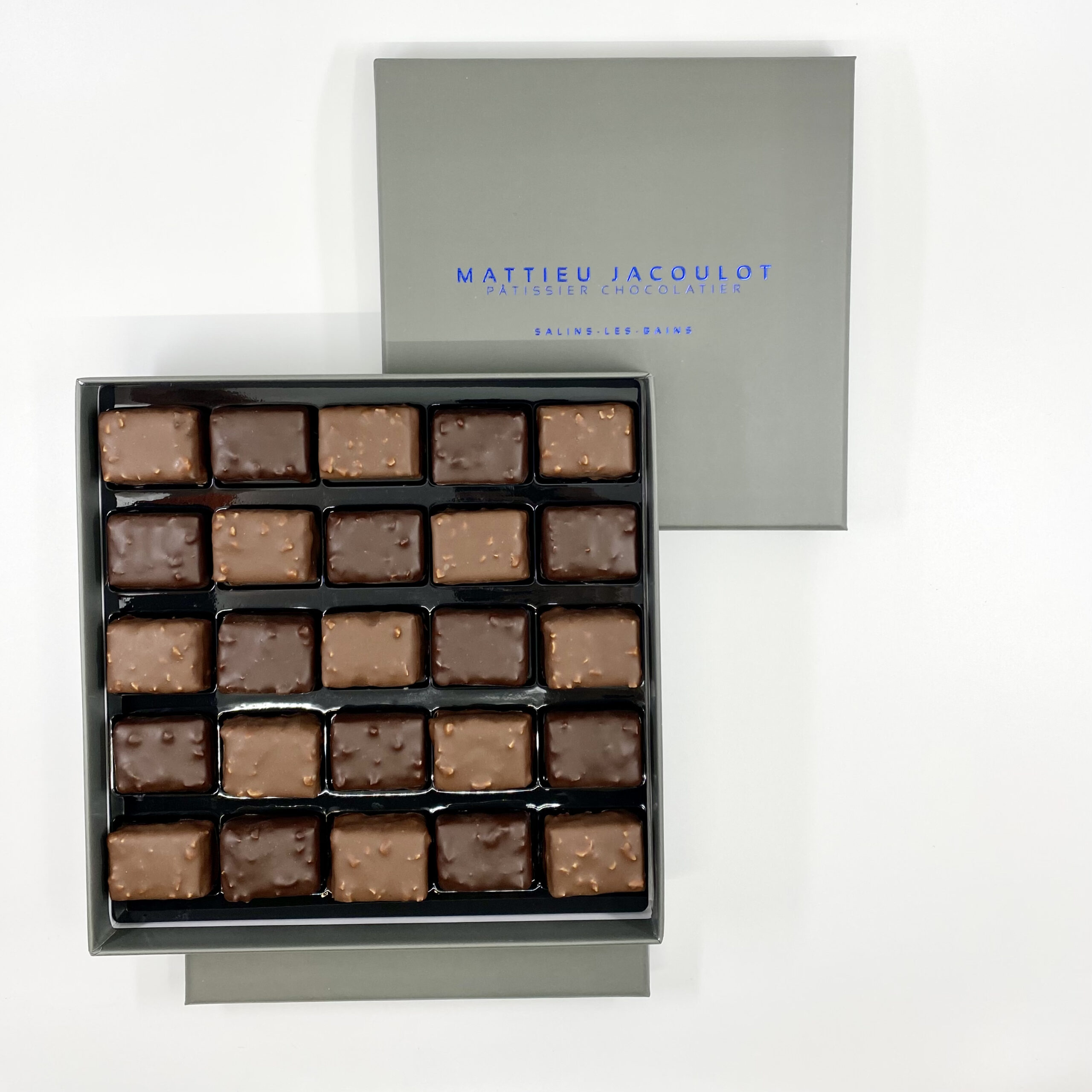 Boîte de rocher, 50% praliné amandes, 50% praliné noisettes du Piémont. Les pralinés sont élaborés exclusivement par nos soins. Tous nos bonbons sont enrobés de chocolats d’origine, noir ou au lait.