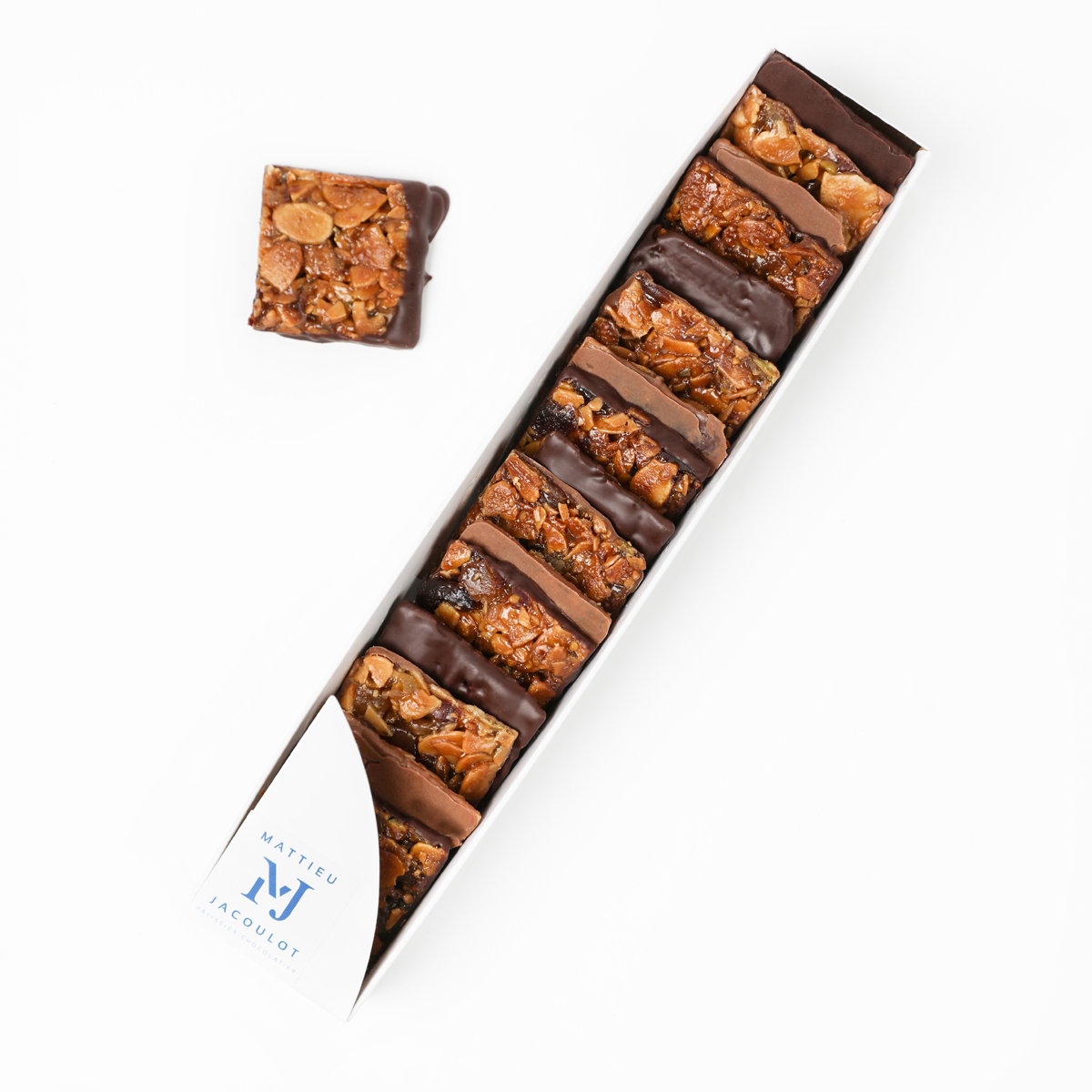 (en gras les allergènes) : sucre, miel, crème, beurre, amandes, noisettes, pistaches, fruits confits : cerises, oranges, citrons, cédrats, lait, cacao, beurre de cacao, chocolat au lait, chocolat noir : lécithine de soja.